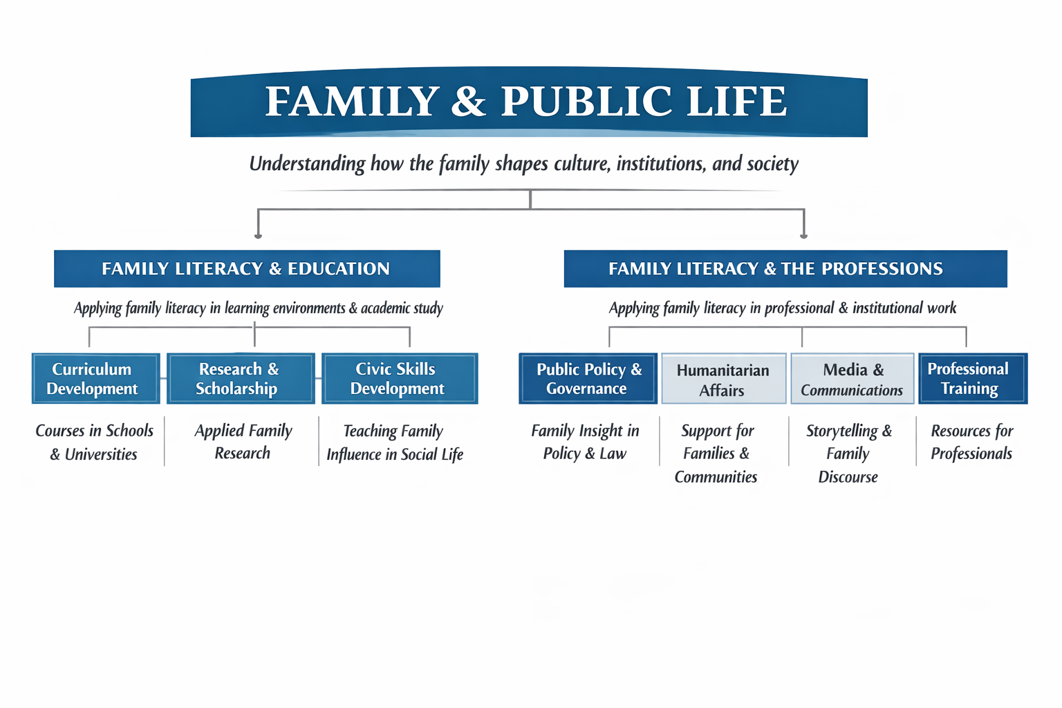 This initative will collaborate with professionals in the public, private, and nonprofit sectors who share a commitment to the family and want to explore how a deeper understanding of family influence in human affairs can strengthen their work. We will offer resources, training, and support to professionals in education, governments, and ministries of family, humanitarian affairs, media, communication and storytelling, nonprofit leadership, public policy, advocacy, and law.